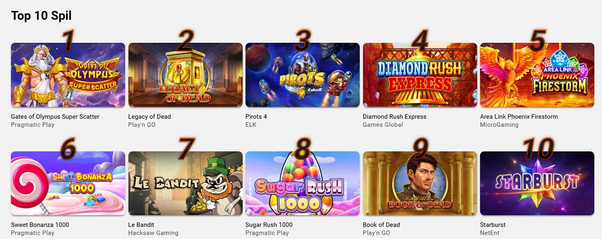 Vi tilbyder over 3.000 spilleautomater og omfattende casinospil fra branchens førende udbydere. Vores spiludvalg spænder fra populære slots med høj RTP til live dealer spil med professionelle dealere.