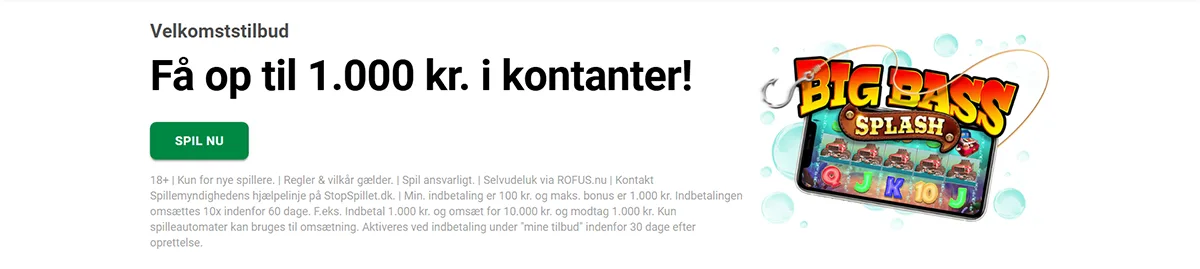 | Casino velkomstbonus | 100% op til 1.000 kr | 10x |